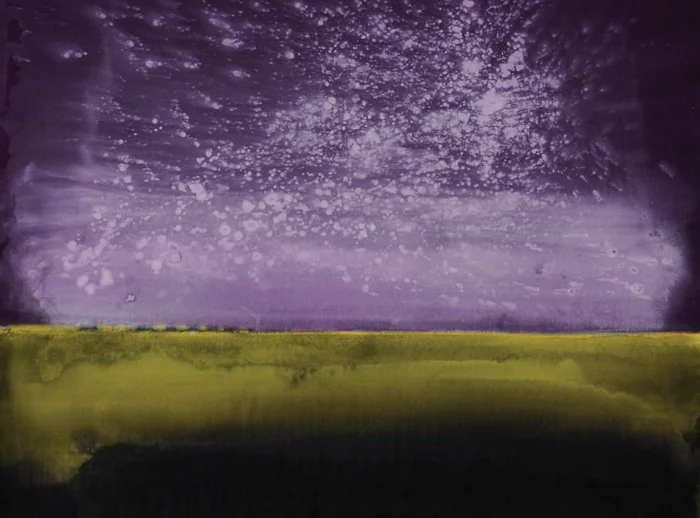The paintings in this series, ‘Living on an horizon’, are made as if they were watercolours on paper. But they are over 2 metres in height and over a metre in width, using acrylic painted upon canvas. Each canvas is stretched on to a board and then stained with washes of acrylic colour. The image is built up in layers, painted into while flooded with water, wet, drying or completely dry. Each colour, because of its chemical make-up, reacts differently to different drying conditions and the different pigments on the canvas. This visual process poetically mirrors how personal circumstance shapes both our inner and our external lives. Each work is made up of a single colour and its complementary plus black and white.The format is the same for each painting.