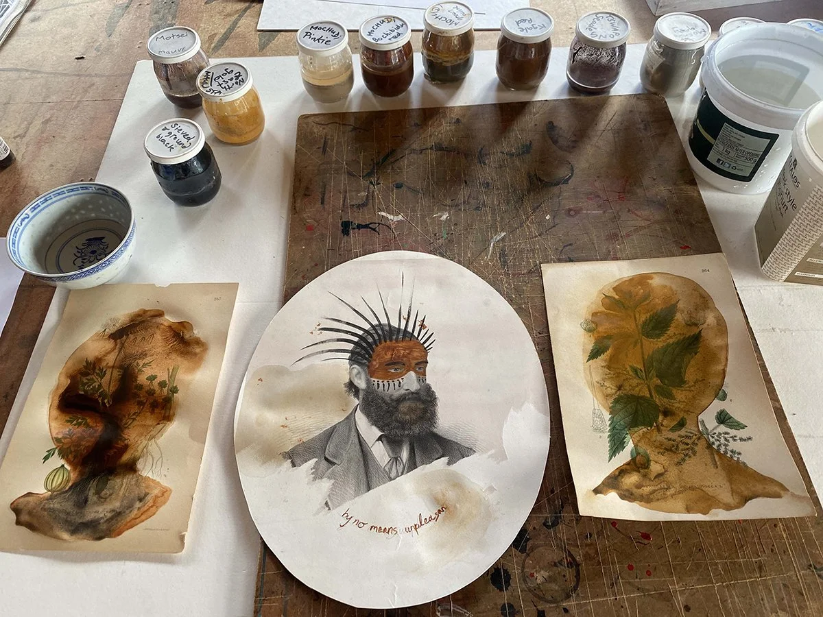 This series By no means unpleasant was inspired by one of the woodcuts I found in the Robert Schomburgk book, Views in the Interior of Guiana 1841. His book contains 12 hand-coloured lithographic plates and numerous monochrome woodcuts scattered throughout the text. In a description of Warao women, he dwells upon their blue facial tattoos and in a typically Victorian compliment, states that he found the overall effectof their appearance, By no means unpleasant. The statement caught my attention as a direct description of my Warao grandmother. It was simultaneously personal, intriguing, dismaying and amusing. It made me think about the social and cultural norms that define particular cultures and how we react to them today and historically. This series is in its infancy and will continue to grow as I work out the questions I wish to ask of Robert Schomburgk and my Grandmother, Marcela Hernandez Valenzuela.